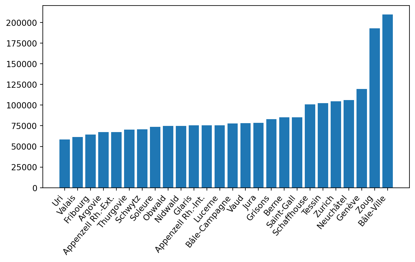 piben divisant la colonnePIB_haben 3 catégories d’amplitude égale : faible < moyen < élevé. Dans quelle catégorie se trouve Neuchâtel ? - Combien de valeurs chacune des catégories contient-elle ?